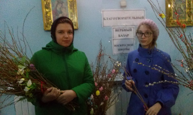 Ученики воскресной школы украсили веточки заранее изготовленными украшениями и рано утром, перед Божественной литургией, праздник начался с «благотворительного вербного базара», на котором, всем пришедшим, ученики воскресной школы предлагали украшенные веточки вербы. Все собранные пожертвования будут переданы семьям многодетных прихожан.