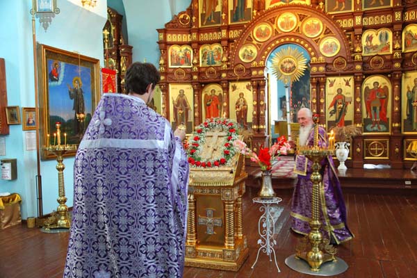 Вечером 13 августа было совершено вечернее богослужение, во время которого из алтаря для поклонения молящихся был изнесен Крест Господень. Богослужение возглавил иерей Георгий Чернявский, ему сослужил диакон Иоанн Алексеев.
