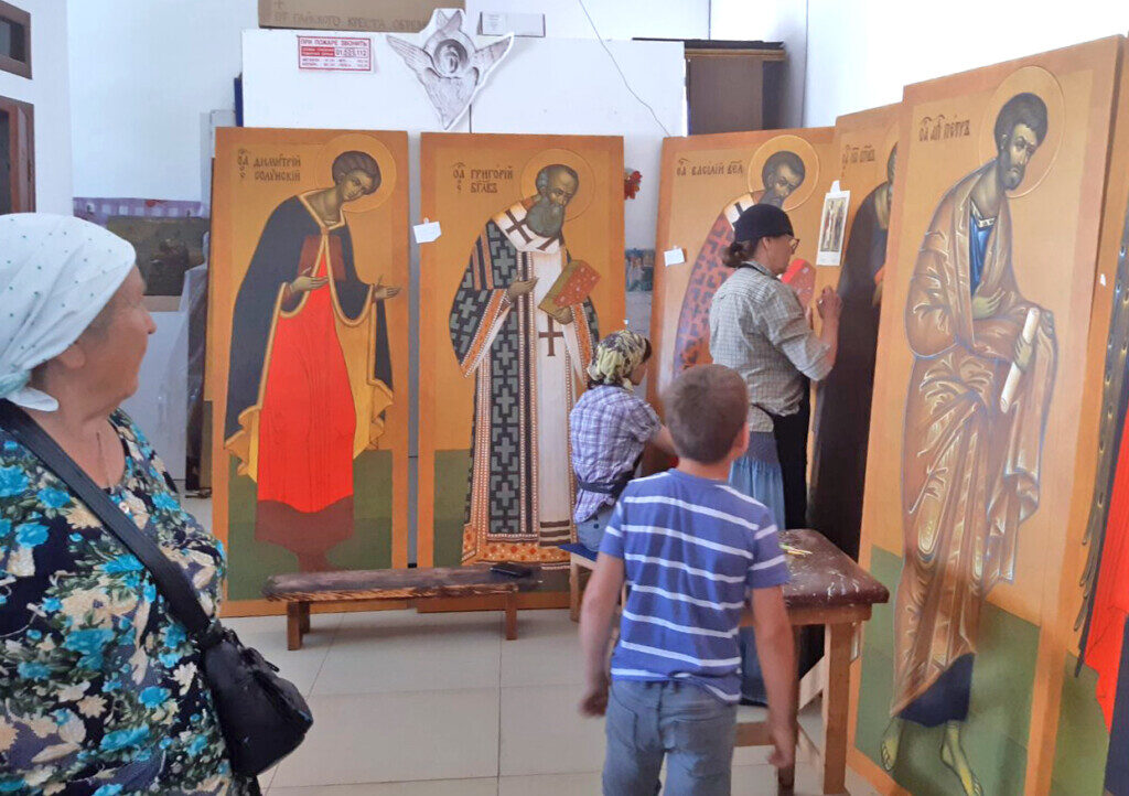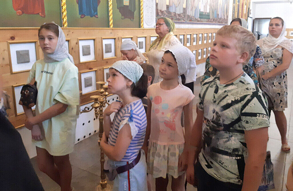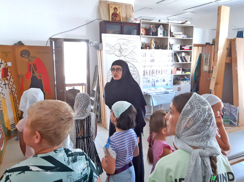 В храме прп. Серафима Саровского дети услышали краткое житие святого. В храме прп. Марии Египетской, им рассказали историю Креста в центре храма. Затем прошли в грузинский храм с «секретной» комнатой – каждый мог в нее зайти и почувствовать какая там замечательная тишина и особая атмосфера. Заглянули в пекарню, где веяло чудесным ароматом от хлеба и булочек. Поздоровались с настоящим конем, дети погладили красавца и отправились в иконописную мастерскую. Мастера работали, дети старались не мешать и с удовольствием слушали как правильно накладывают краски и золотят иконы.
