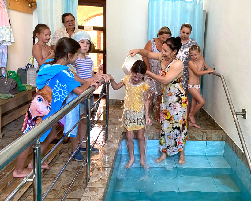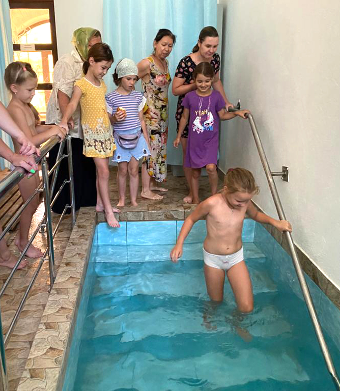 Поблагодарив послушницу Елену за экскурсию, покушав ароматных булочек, паломники направились к водосвятной часовне в честь прп. Серафима Саровского, где окунулись в святых водах, затем прошли с молитвенным пением по Богородичной дорожке.