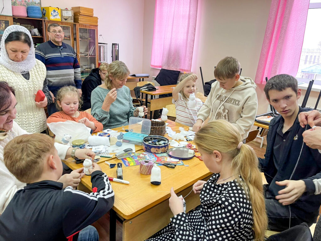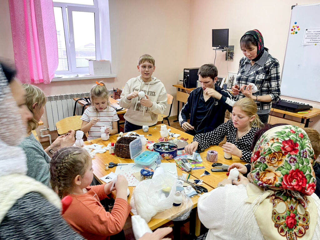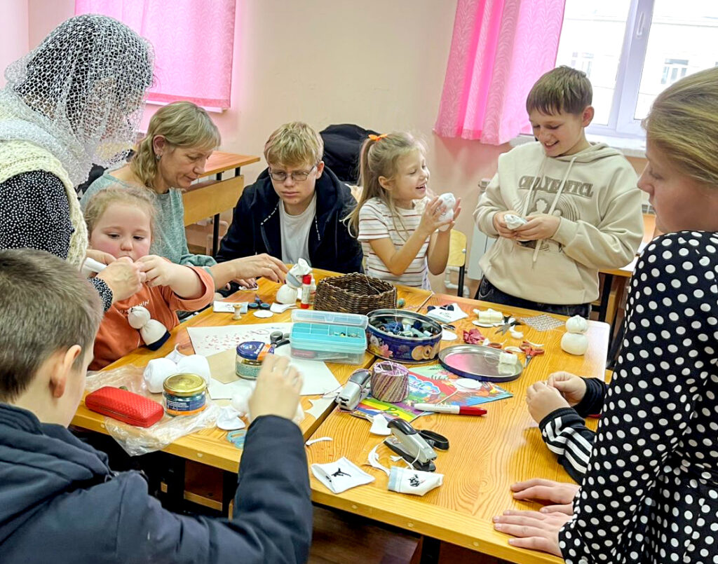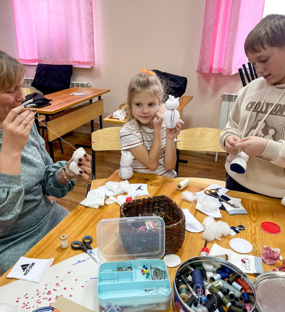 На втором уроке ученики и родители начали подготовку к Рождеству Христову. Решили в первую очередь сделать подарки воинам на фронт – весёлых снеговиков. Ребята творили с увлечением, помогая друг другу. Для всех оказалось очень увлекательно шить снеговиков, тем более что каждый представлял, что этому снеговичку улыбнется солдат…