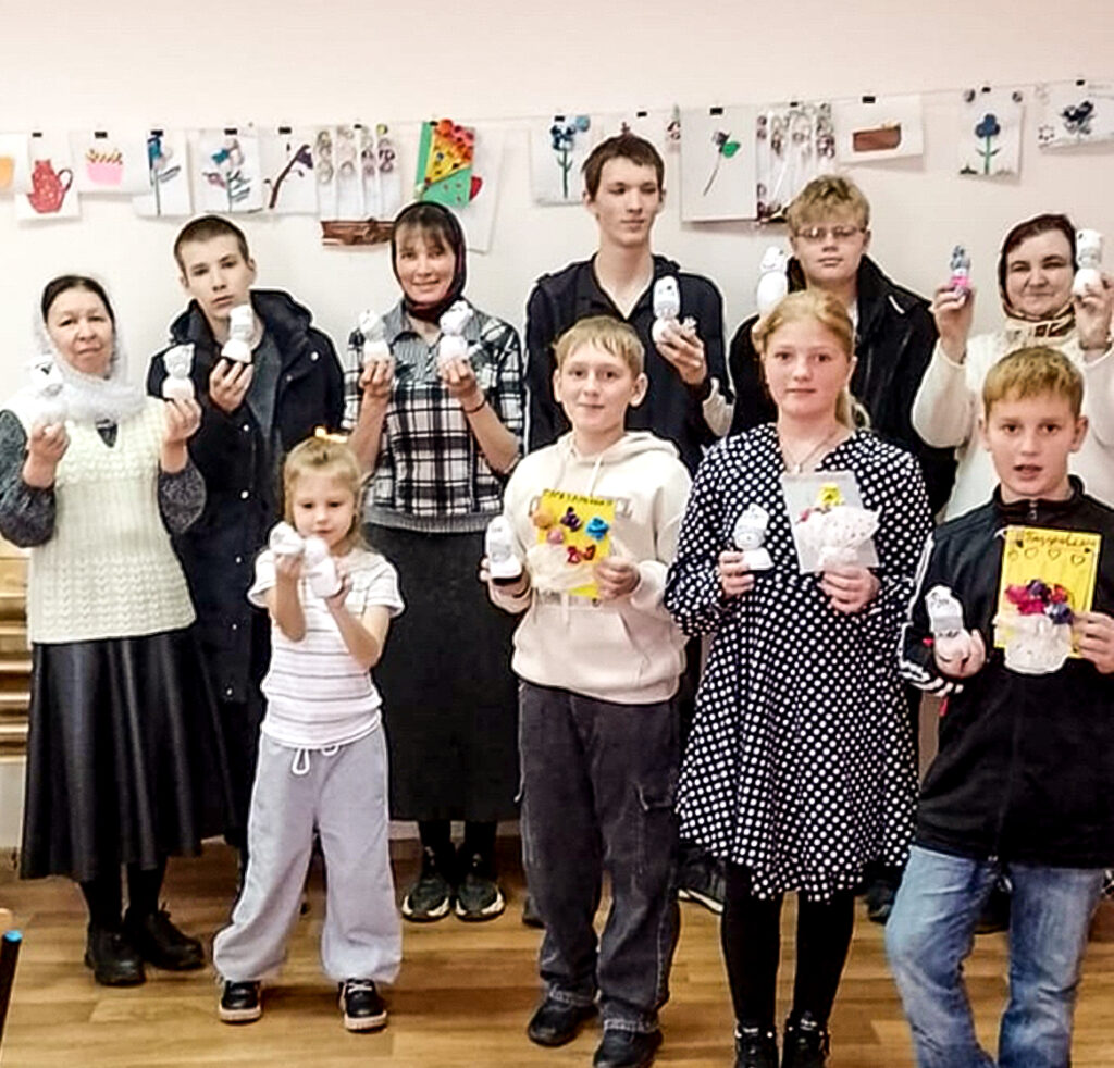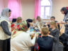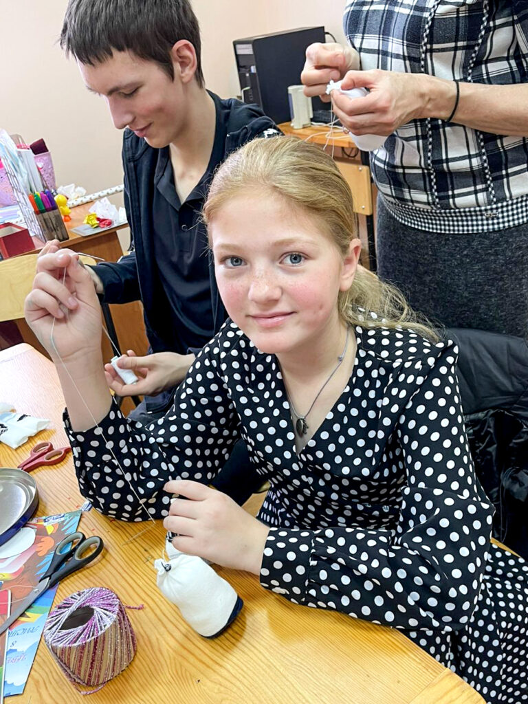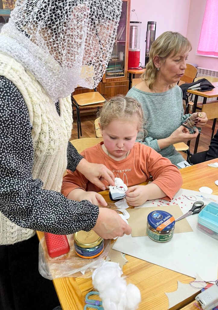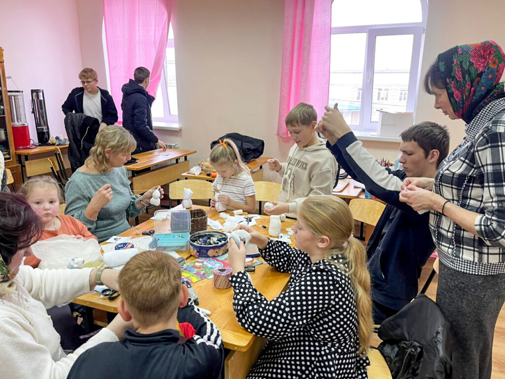 На втором уроке ученики и родители начали подготовку к Рождеству Христову. Решили в первую очередь сделать подарки воинам на фронт – весёлых снеговиков. Ребята творили с увлечением, помогая друг другу. Для всех оказалось очень увлекательно шить снеговиков, тем более что каждый представлял, что этому снеговичку улыбнется солдат…