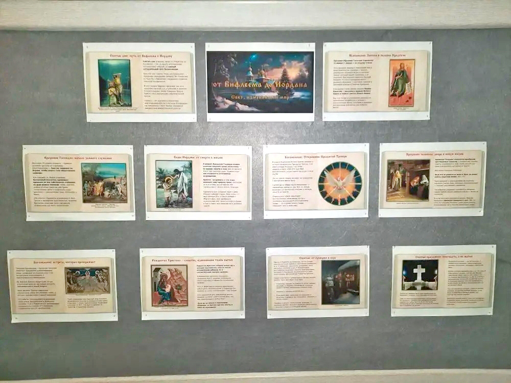 По благословению настоятеля храма протоиерея Анатолия Сопиги в храме преподаватели воскресно-приходской школы разместили стенды, посвященные Рождеству Христову и Крещению Господню. Прихожане храма и гости города смогли ознакомиться с презентацией «от Вифлеема до Иордана…Свет, изменивший мир», предоставленной Синодальным Миссионерским отделом Русской Православной Церкви.